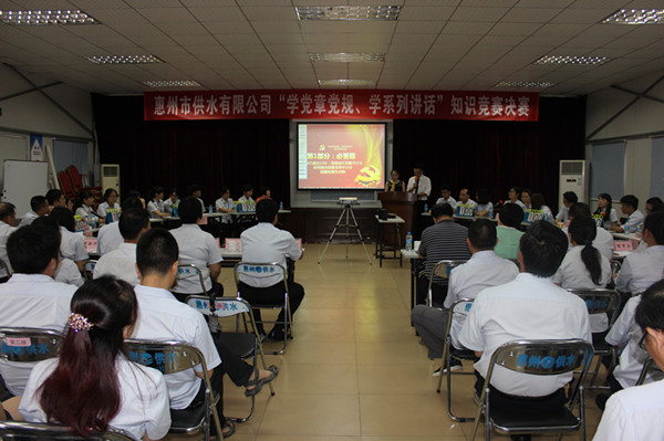 為進(jìn)一步營(yíng)造“兩學(xué)一做”學(xué)習教育的濃厚氛圍,7月11日下午,一場(chǎng)別開(kāi)生面的“學(xué)黨章黨規,學(xué)系列講話(huà)”知識競賽決賽在市供水公司隆重舉行。市水務(wù)集團黨委委員、監事會(huì )主席羅運通、市供水公司領(lǐng)導班子成員、黨員代表等90多人觀(guān)看了比賽。