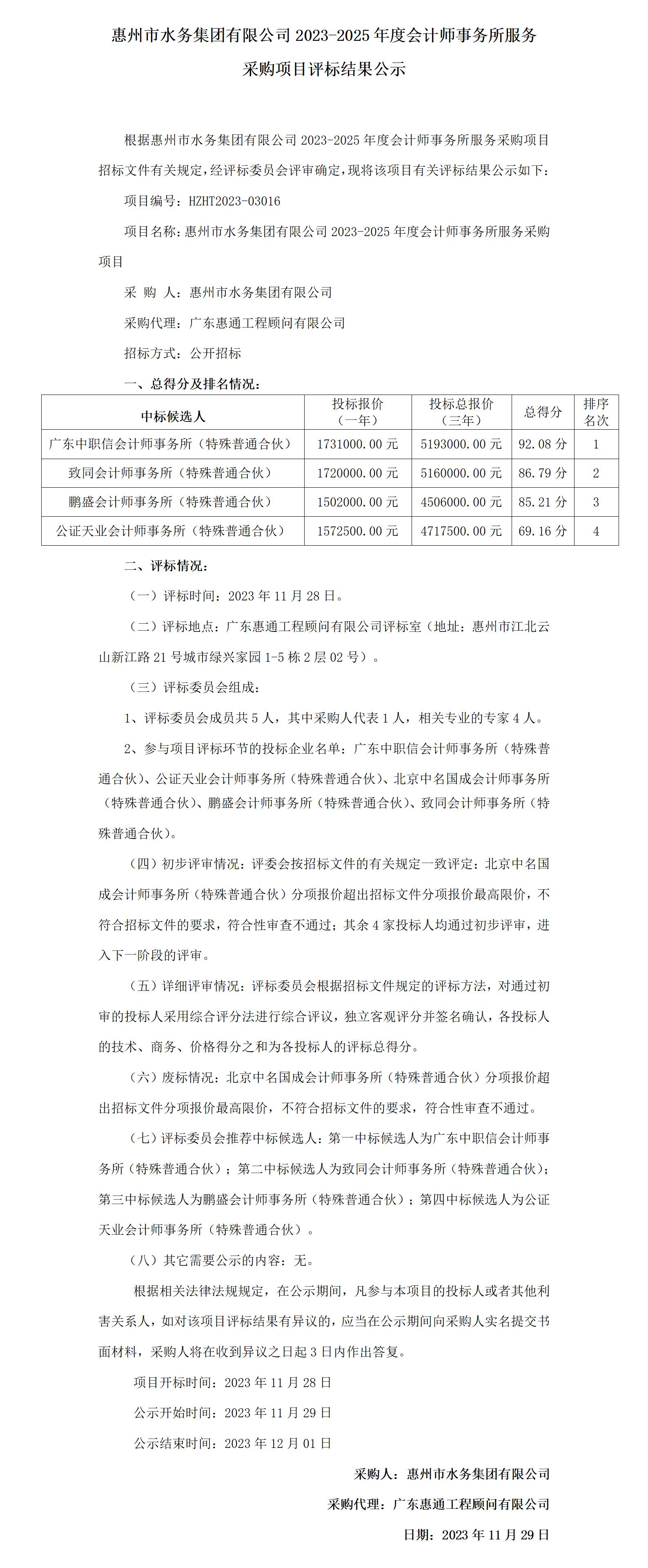 惠州市水務(wù)集團有限公司2023-2025年度會(huì )計師事務(wù)所服務(wù)采購項目評標結果公示