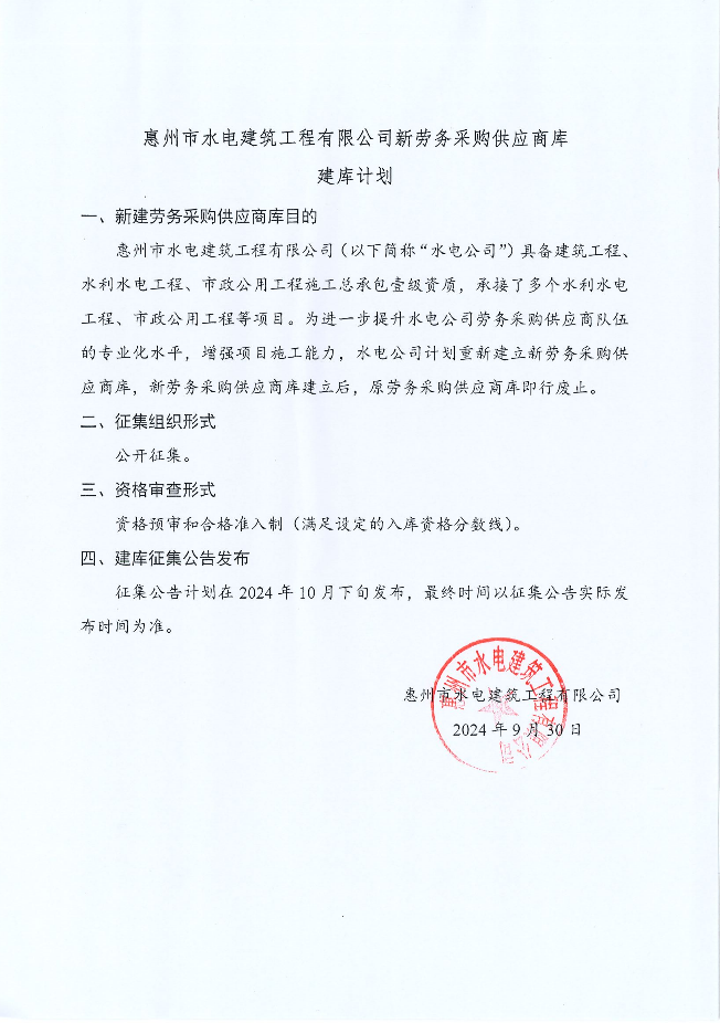惠州市水電建筑工程有限公司新勞務(wù)采購供應商庫建庫計劃