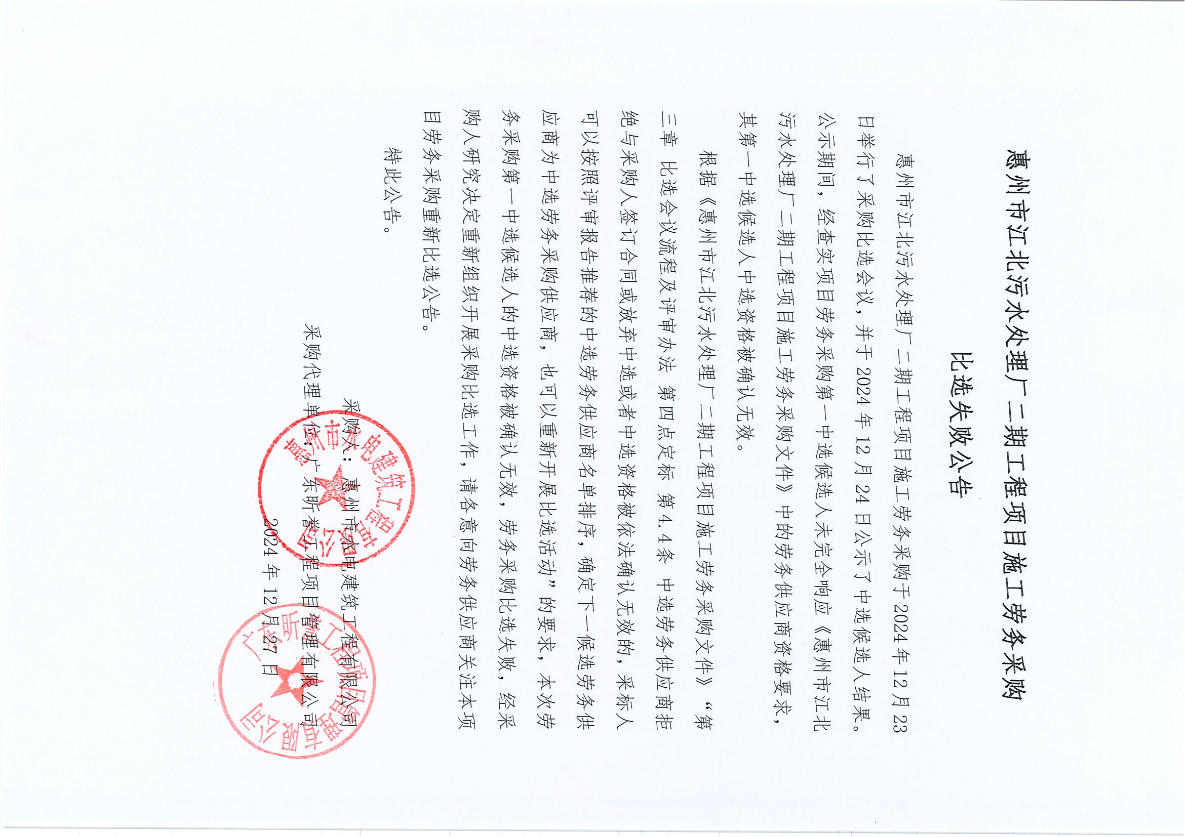 惠州市江北污水處理廠(chǎng)二期工程項目施工勞務(wù)采購比選失敗公告