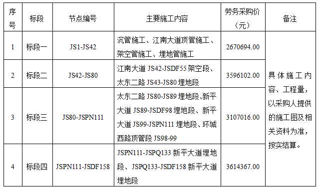 注:①項目實(shí)施過(guò)程中,出現工程量清單增減項的情況,若工程量清單增項,由已中選的各勞務(wù)供應商實(shí)施,如增項清單在其他標段有相同清單,則其最終單價(jià)等于其他標段勞務(wù)采購工程量清單的單價(jià)乘以【1-下浮率(報價(jià))(本標段)】,雙方簽訂補充協(xié)議;若工程量清單減項,勞務(wù)采購中選供應商不得以此為由向采購人索賠。