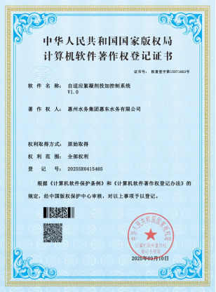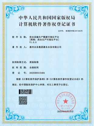3月10日,惠州水務(wù)集團所屬惠東水務(wù)公司技術(shù)信息中心自主開(kāi)發(fā)的軟件系統《供水設施生產(chǎn)數據可視化平臺》、《自適應絮凝劑投加控制系統》經(jīng)國家版權局中國版權保護中心審查,獲計算機軟件著(zhù)作權登記證書(shū)。