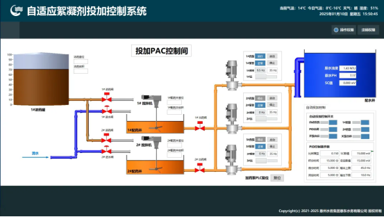 系統主要功能 該系統具備絮凝劑智能投加功能,通過(guò)多參數水質(zhì)數據(流量/溫度/濁度/pH等)自動(dòng)調節PID實(shí)現精準控制,同步兼容手動(dòng)干預模式。實(shí)時(shí)監測藥罐液位與攪拌狀態(tài),確保藥劑配備充分、混合均勻,保障絮凝工藝穩定高效運行。