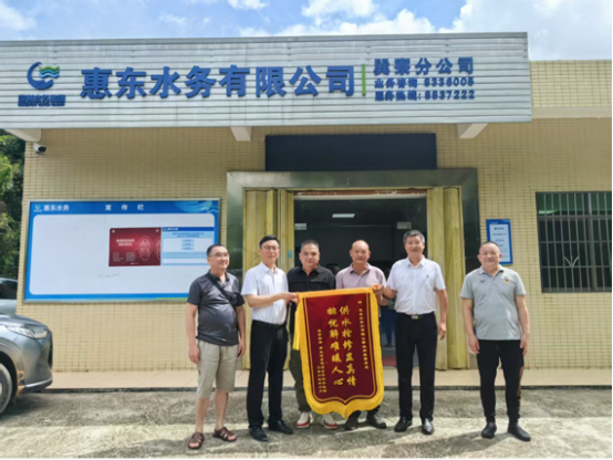 2025年6月19日,合生海岸花園業(yè)主代表與物業(yè)經(jīng)理向惠東水務(wù)稔山營(yíng)業(yè)所巽寮營(yíng)業(yè)網(wǎng)點(diǎn)贈送錦旗,上書(shū)“供水搶修顯真情,排憂(yōu)解難暖人心”,感謝該網(wǎng)點(diǎn)快速解決小區用水問(wèn)題。