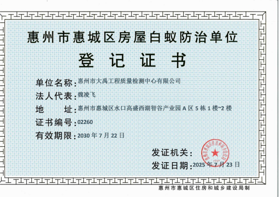 近日,惠州水務(wù)集團大禹檢測公司順利拿下廣東省住房和城鄉建設廳頒發(fā)的建設工程質(zhì)量檢測機構資質(zhì)證書(shū)(編號:(粵)建檢專(zhuān)字第20250046號),資質(zhì)范圍覆蓋建筑材料及構配件、主體結構及裝飾裝修、鋼結構、地基基礎、市政工程材料、道路工程等六大專(zhuān)項,突顯大禹檢測公司在建設工程質(zhì)量檢測領(lǐng)域的整體實(shí)力邁上新高度;同步獲惠州市惠城區住房和城鄉建設局頒發(fā)的房屋白蟻防治單位登記證書(shū)(編號:02260)。至此,公司成為惠州少數具備“檢測+防治”一體化服務(wù)能力的機構。
