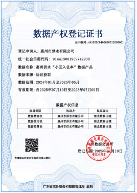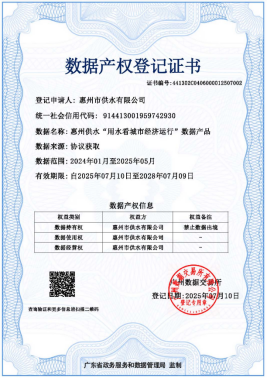 惠州水務(wù)集團供水公司再添兩張數據產(chǎn)權登記證書(shū),數字化轉型成果豐碩