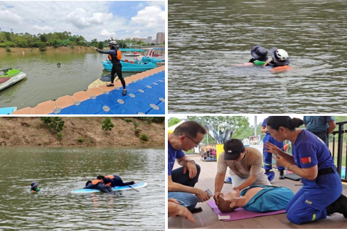 8月22日上午9時(shí),桃花源游客服務(wù)中心聯(lián)合惠州市藍天救援隊、惠州市槳板運動(dòng)協(xié)會(huì )在桃花源水上運動(dòng)中心開(kāi)展“防溺水專(zhuān)項應急演練”。此次演練統籌組織了景區保安、水上項目全體員工、經(jīng)營(yíng)業(yè)態(tài)負責人等30余人,圍繞“發(fā)現—呼救—救援—醫療”全鏈條開(kāi)展實(shí)戰化水上安全救援演練。
