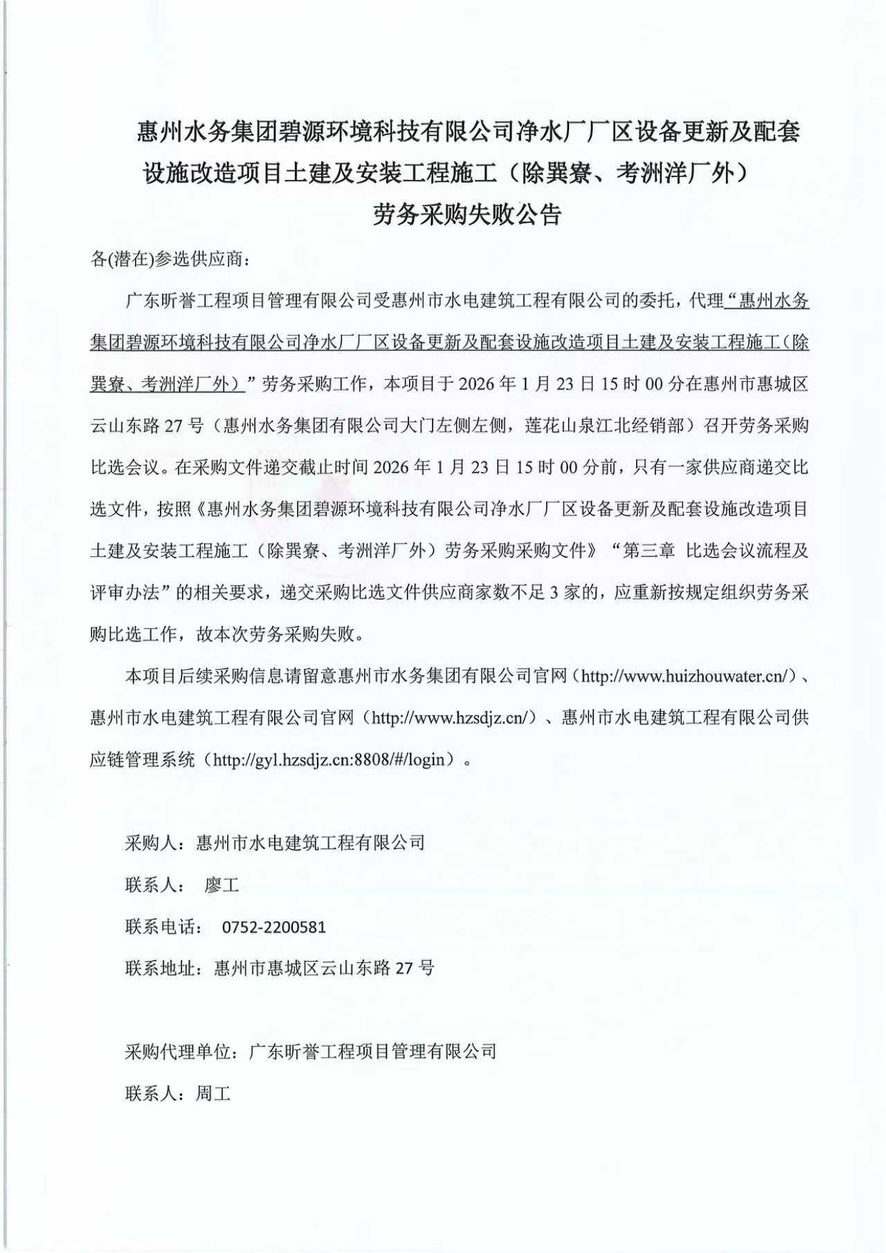 惠州水務(wù)集團(tuán)碧源環(huán)境科技有限公司凈水廠廠區(qū)設(shè)備更新及配套設(shè)施改造項(xiàng)目土建及安裝工程施工(除巽寮、考洲洋廠外)勞務(wù)采購(gòu)失敗公告